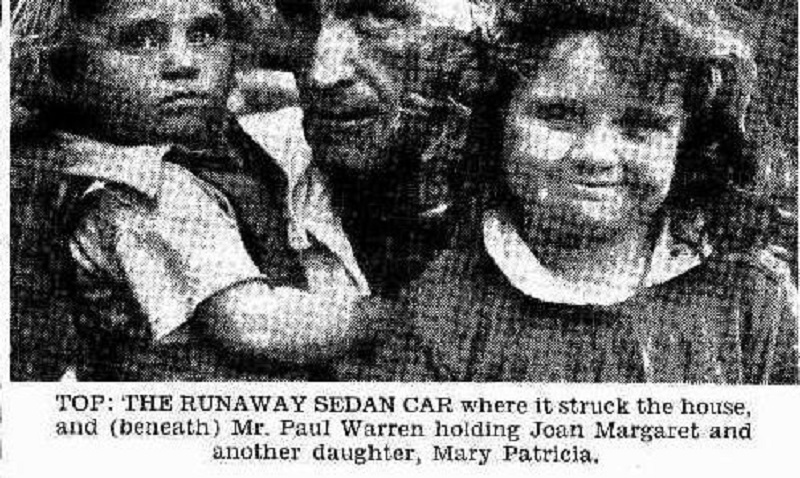 This was the third such accident’ which has occurred at this house, which is on the angle between Gap Road and Dunbar Street, Watson’s Bay. The baby, Joan Margaret Warren, 20 months old, was standing inside the doorway of the house, when the car crashed through the fence, leaped on to the verandah, and flung her into the hallway unhurt. The car, which was driven by Ramsay George Lobb, was not seriously damaged, and none of its Ave occupants was hurt. Posts holding the corrugated iron roof of the verandah were dislodged.